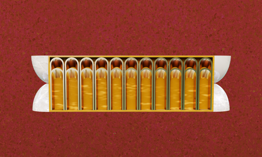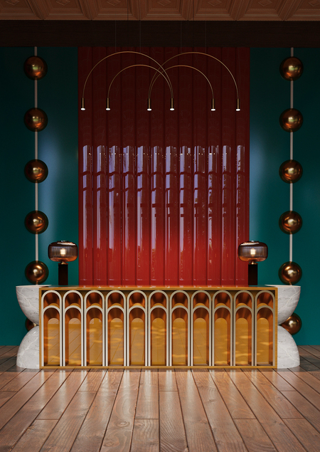 Стойка ресепшен отражает общую стилистику интерьера. Она выполнена из латуни и двух видов камня, с использованием цветовой палитры креативного пространства. Ее необычная форма отсылает к игровым фишкам и прекрасно сочетается с другими элементами входной зоны.