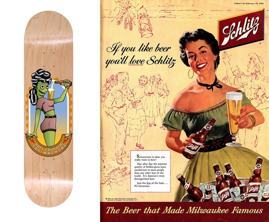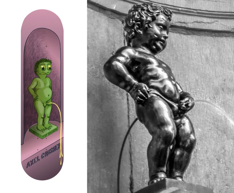 пример визуального материала: графика на деках Toy Machine, Manneken Pis, графика рекламных плакатов 60-х годов
