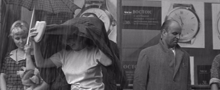 Дождь в кино 1960-х — «чистой воды поэзия». Это код, с помощью которого советский кинематограф показывает чувства, а не подвиги. Образ создает новую визуальную эстетику (нежного и, повторюсь, поэтического свойства), противопоставленную парадным изощренностям прошлой эпохи. Его используют, чтобы отразить «сложность» внутренного мира героя, передать накал страданий, эмоциональный надрыв. Сцены под дождем часто становятся лирическими паузами, где мы подчиняемся логике чувств, ассоциаций, а не драматургическим сломам. Реальность становится зыбкой, субъективной, что так нужно было природе «оттепельного» киноязыка.