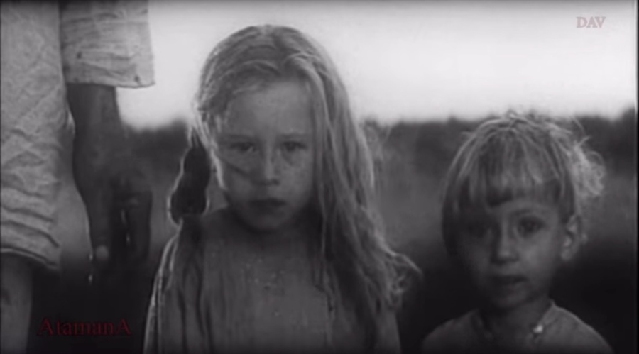 Человеческие глаза болезненно обращены к камере, как бы пытаясь сказать: «На что надеяться теперь.?» Тебе приходится лишь догадываться, с чем эти люди смотрят на тебя: с обвинением или с мольбой. Возникает чудовищный диссонанс: мы наблюдаем жесточайшие страдания, но слышим идею «о великом коммунизме». Иллюзия слома четвертой стены здесь обнажает конфликт очень ярко.