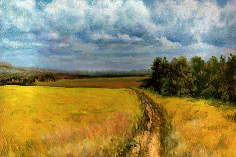 Фото 1: Владимир Абаимов. Абстрактный пейзаж. 2021. Картон, масло Фото 2: Владимир Абаимов. Среди полей. Середина августа. 2024. Холст, масло