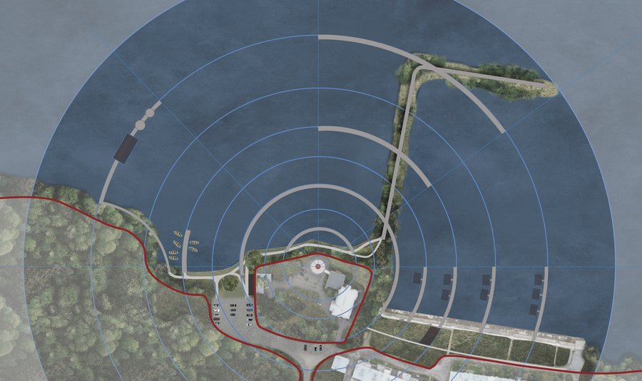 Графика генерального плана основывается на расходящихся от маяка направляющих окружностей, напоминающих радиоволны.
