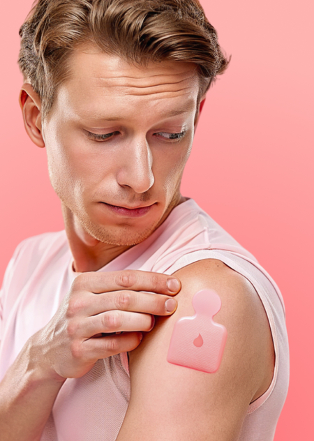 Девушка и молодой человек были также сгенерированы Recraft (стиль photorealism) в соответствии с выбранной палитрой. Промпты соответственно: a woman glues a anti-anxiety patche in the shape of a human icon on her shoulder; a white person in a stressful situation glues a patch on his shoulder.