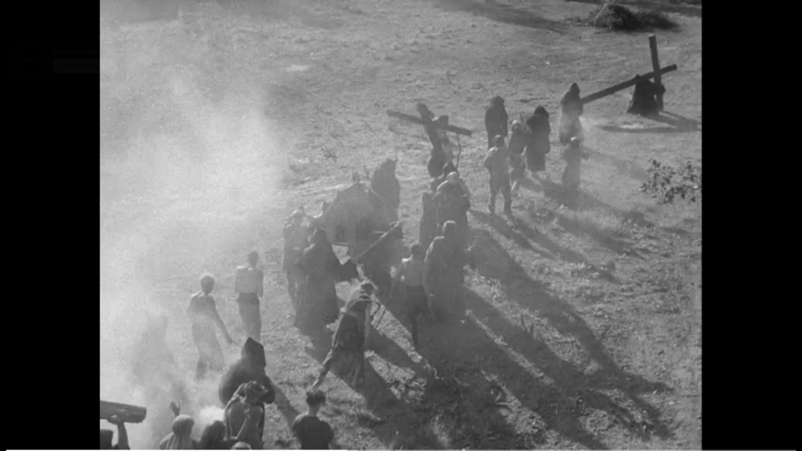 Еще одним примером использования средневековой системы символов служит кадр с крестом, нарисованным на полу солнечным светом проходящим через оконную раму. Крест выступает свидетельством невиновности и святости Жанны, божественного присутствия рядом с ней и выдает лживые намерения священника, ненароком наступившего на крест.