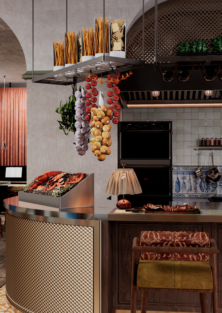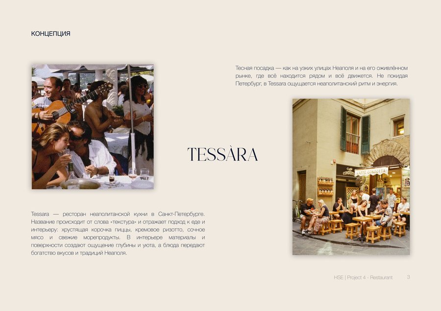Дизайн-проект ресторана неаполитанской кухни «Tessara» площадью 294 м². Концепция строится на переосмыслении образа Италии — не туристической, а живой и насыщенной: тесная улица и шумный рынок с морепродуктами и вином.