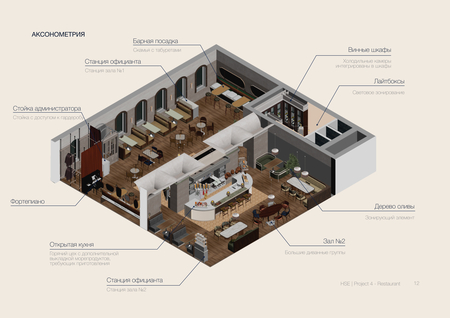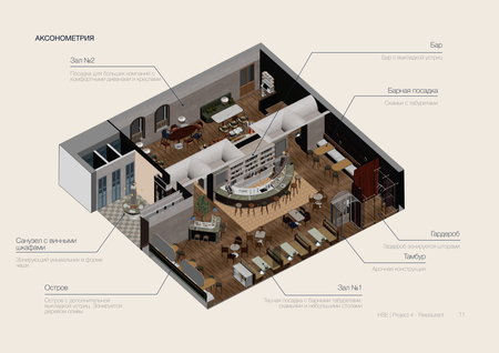 Пространство разделено на два зала с разной атмосферой, объединённых зеркальной композицией бара и открытой кухни, которые становятся визуальными и смысловыми центрами интерьера
