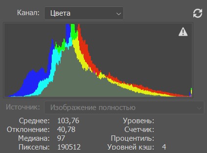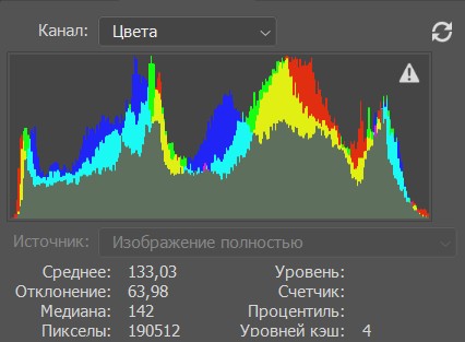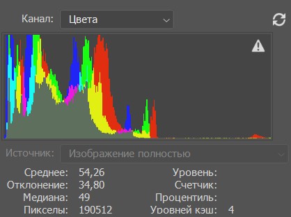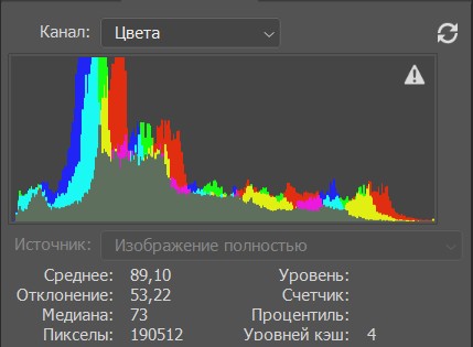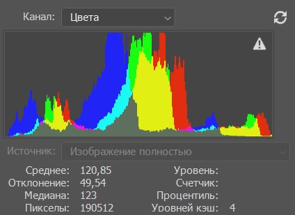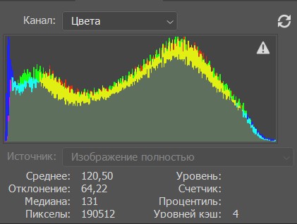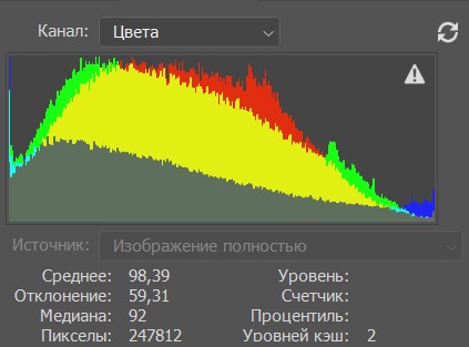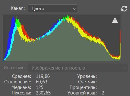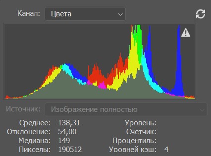 Свет Гистограмма «Лес 2» имеет выраженную двухгорбую структуру: — тёмно-синие и зелёные зоны — лесные тени, — светлые жёлтые и красноватые зоны — солнечные участки. Эта форма гистограммы — признак сильного светового контраста, характерного для леса при низком солнечном угле. Между двумя «горбами» есть провал — показатель того, что средних тонов в сцене немного: распределение света делится на тени и проблески света.