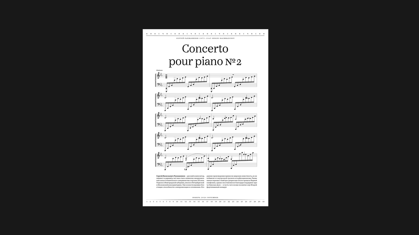 Числа месяца ритмично выстроены на линейках по низу страницы, словно ноты на музыкальном стане