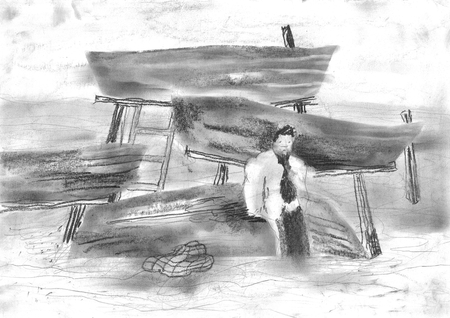 «Рыбаки» — графическая серия многофигурных композиций, где каждая работа передаёт разное настроение и состояние природы. В серии исследуются разные аспекты рыболовства — от спокойного ожидания у причала до напряжённой борьбы с неприятной погодой.