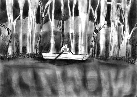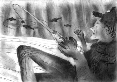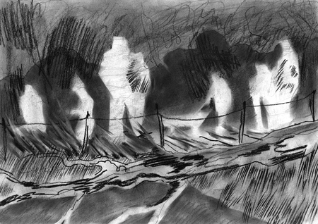 Работы, выполненные углем, передают контраст света и тени для эмоциональной составляющей каждого сюжета.