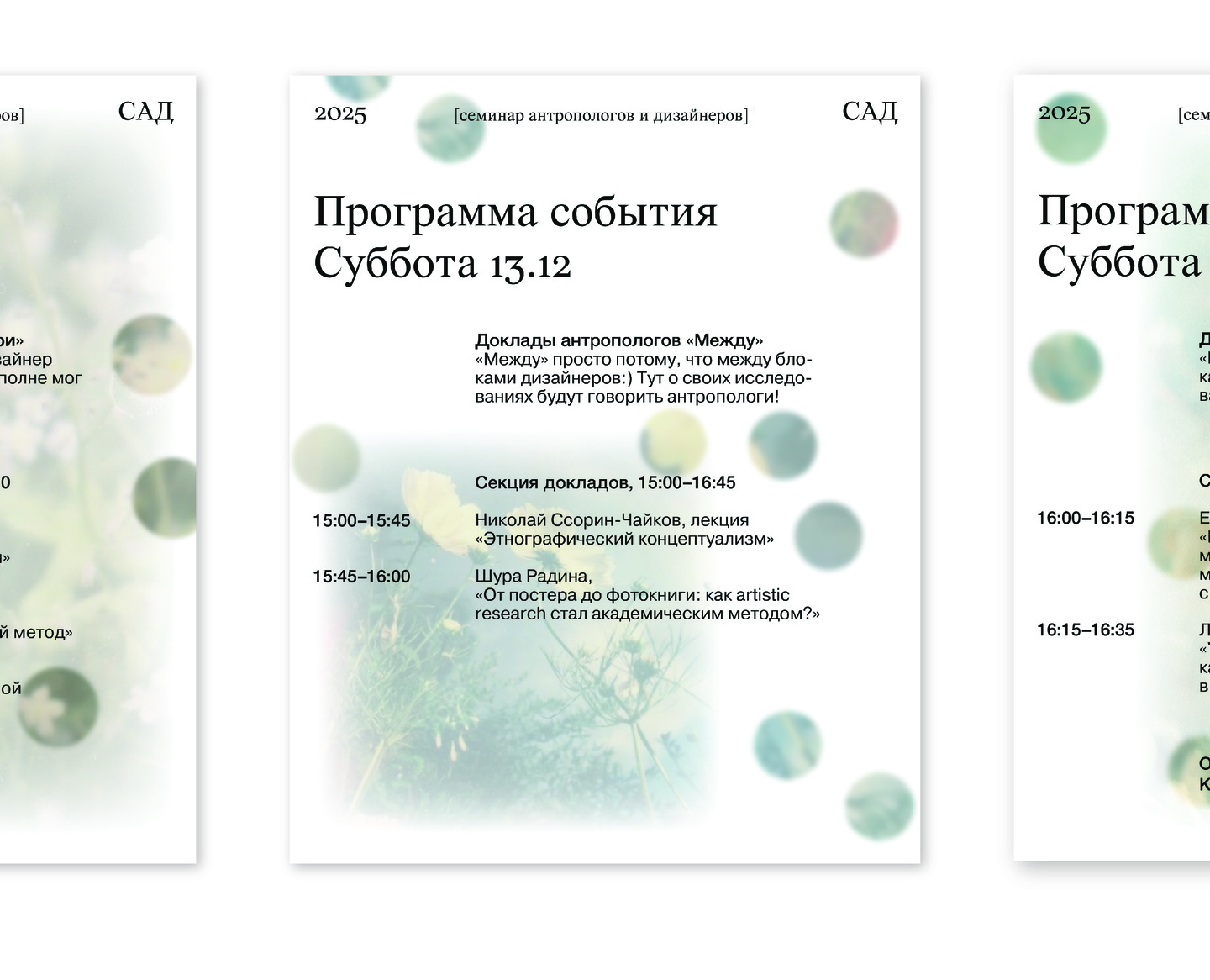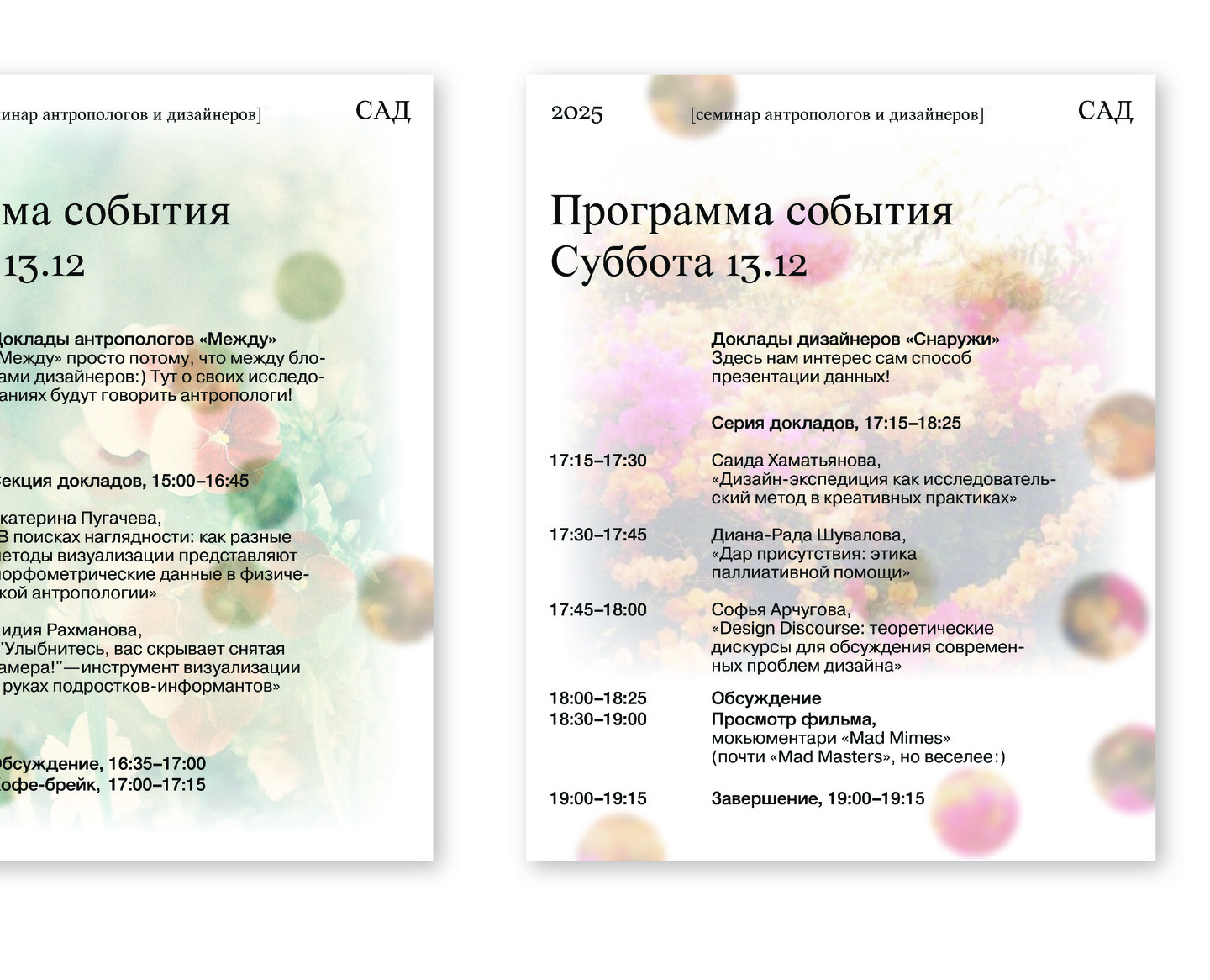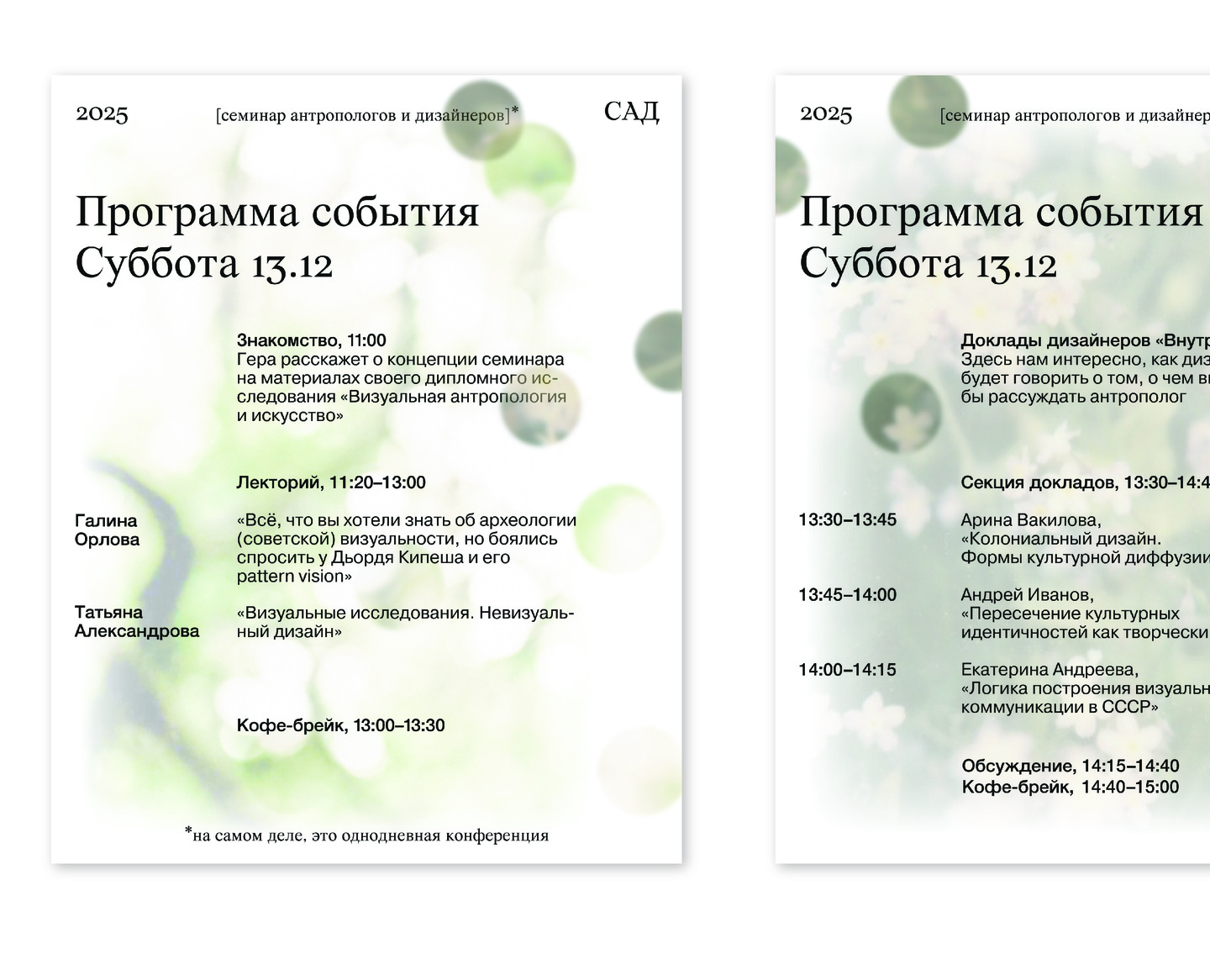 Аббревиатура САД стала для нас не просто названием, а источником вдохновения, задав флоральную тему. Эта идея «сада», места роста, переплетения идей, легла в основу всей визуальной системы, что отражено в программе встречи и афишах