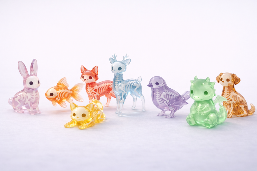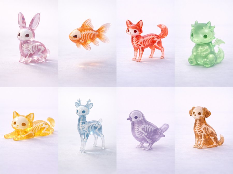 Проект представляет собой серию/коллекцию декоративных 3D-объектов. В основе коллекции лежит образ прозрачного тела животного с видимым внутренним скелетом. При этом формы намеренно упрощены и сделаны мягкими, почти игрушечными. Фигурки лишены индивидуализированных черт, что позволяет воспринимать их не как конкретных персонажей, а как универсальные образы, в которых каждый может найти собственные ассоциации.