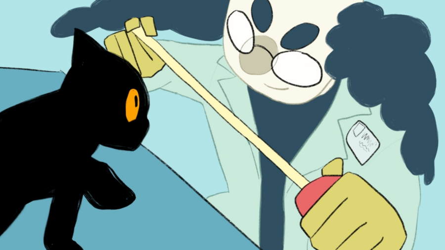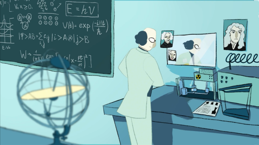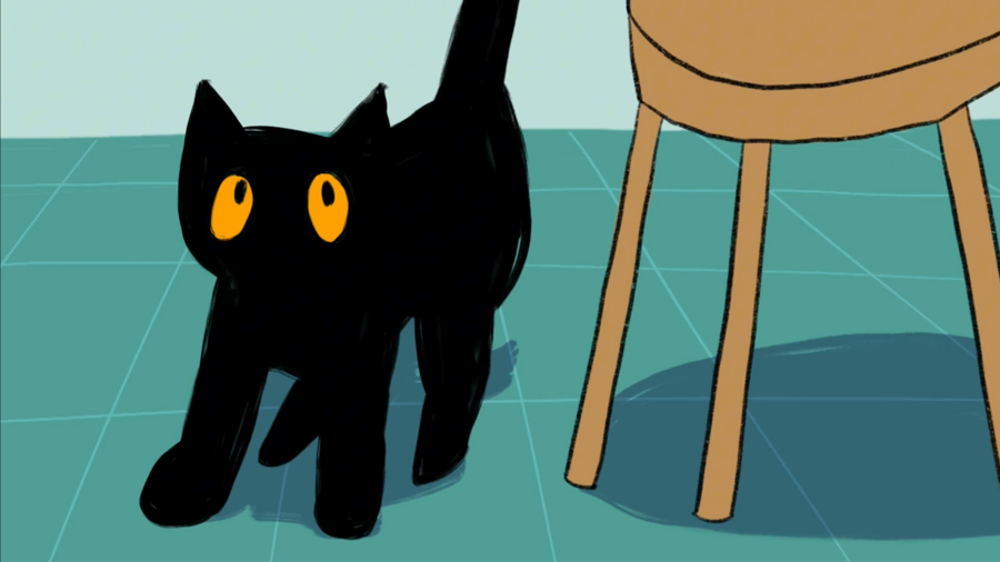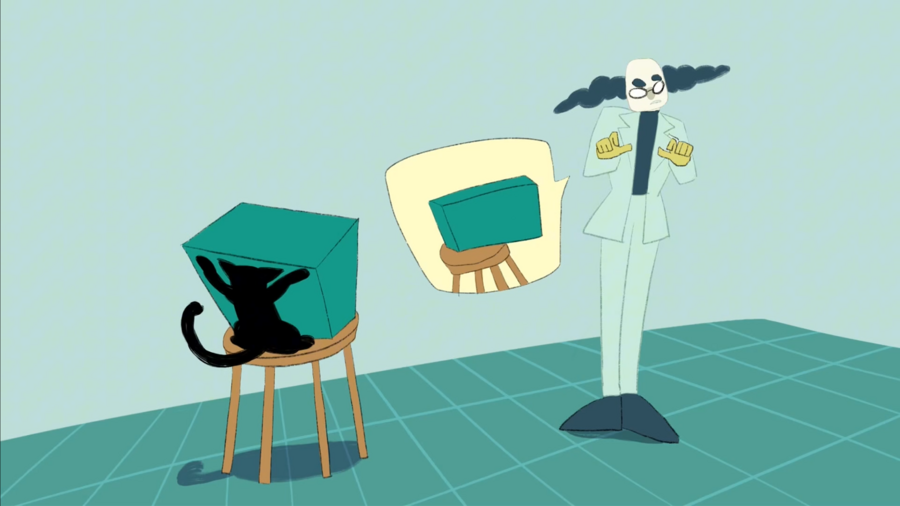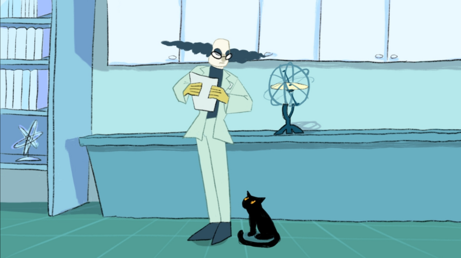 Промт: «Illustration for an animated cartoon about a scientific laboratory, centered around Schrödinger’s cat. The cat is playful and curious, interacting with lab equipment like microscopes, test tubes, and computers. Style: clean pencil line art with flat color fills, simple and charming, suitable for animation backgrounds and characters, soft colors, whimsical and friendly atmosphere, focus on both the cat and laboratory setting, clear shapes and readable composition.»
