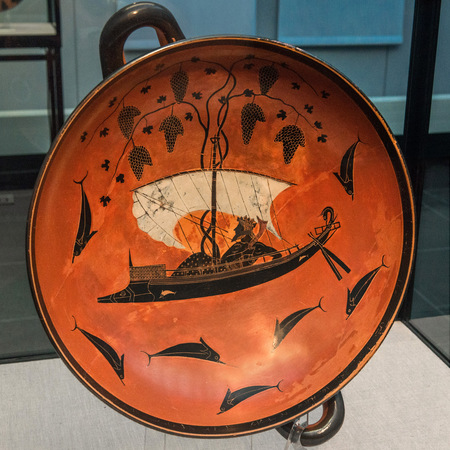 Немаловажно, что килик служит иллюстрацией к легенде о Дионисе и тирренских пиратах. Вокруг судна, на котором плывет бог, изображены дельфины, в которых были превращены пираты, наказанные Дионисом за свои злодеяния. Это превращение в том числе символизирует круговорот жизни, перерождение и вечную цикличность бытия, напоминая о неизбежности изменений и трансформации в природе и человеческом существовании.