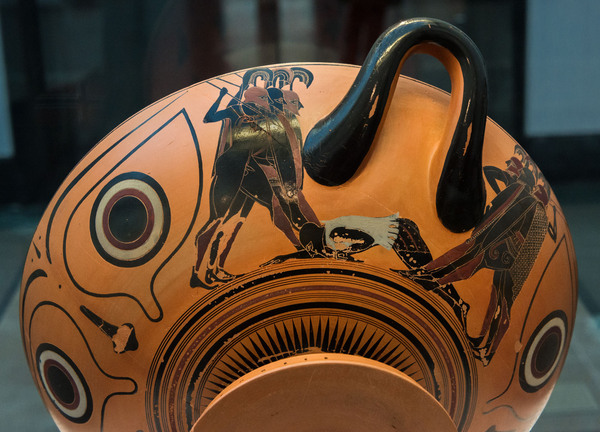 На щите, изображенном на данном сосуде, присутствует изображение глаза, что можно интерпретировать как символ защиты и противодействия злу. В мифологическом контексте глаз часто ассоциируется с магической силой и способность видеть невидимое, что делает его идеальным элементом для использования на элементах защиты.
