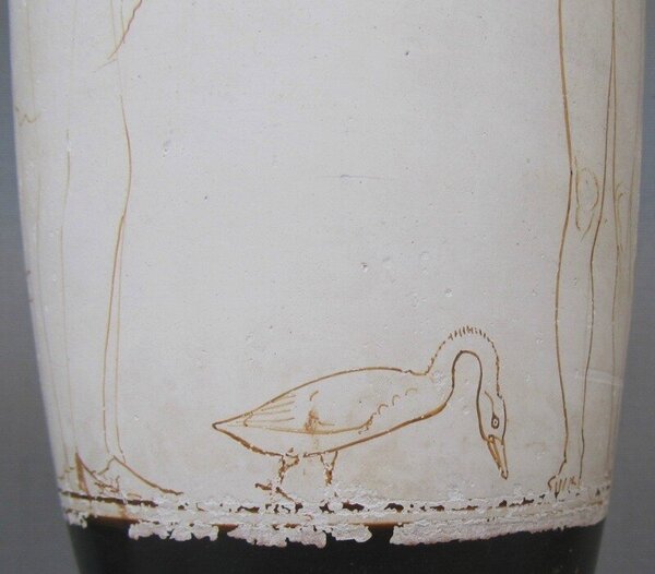 На сосуде между мужчиной и женщиной неожиданно появляется изображение гуся. Как и другие водоплавающие птицы, гусь ассоциируется с переходом в другой мир, благодаря своей уникальной природе. Она характеризуется способностью находиться как на поверхности воды, так и под ней, что позволяет гусю проводить значительную часть своей жизни в пограничном положении между двумя мирами. Символическое значение птицы гуся таким образом подчеркивает рубежность состояния воина, который, возможно, отправляется на гибель