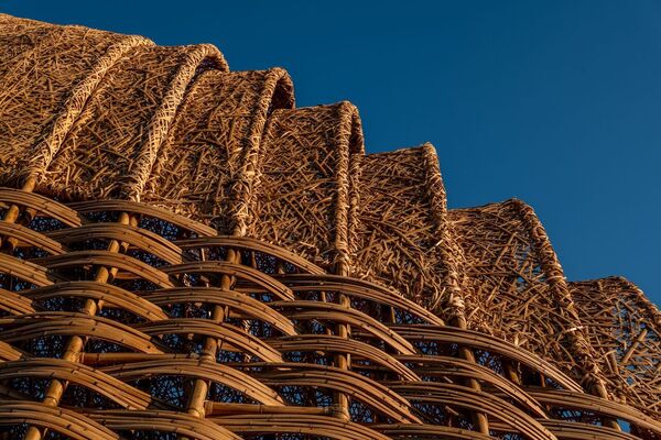 2. Плетение в архитектуре Здесь анализируется переход от примитивных плетёных жилищ к современным архитектурным объектам, где плетение используется как структурная логика, фасадный паттерн, бионическая метафора, климатический элемент или генеративная оболочка.
