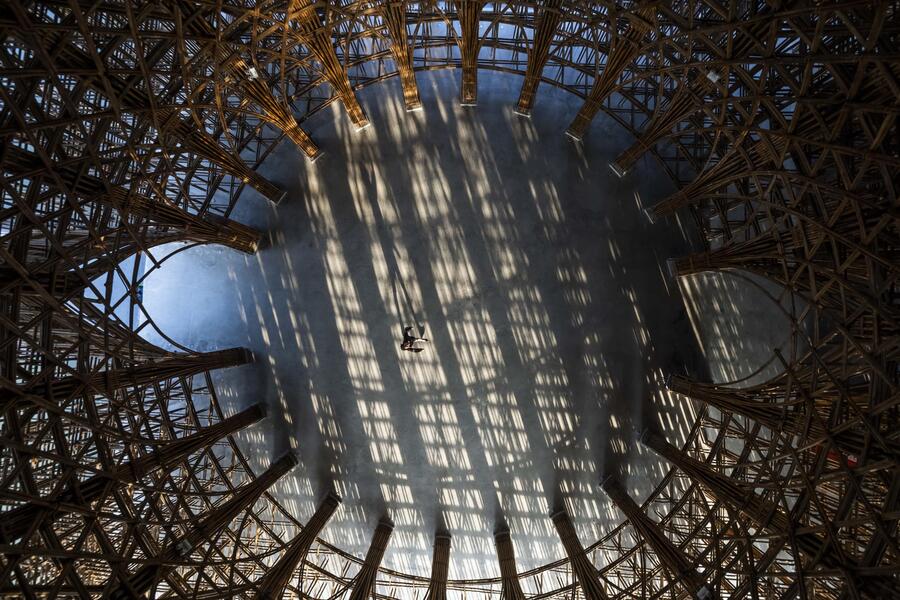 Плетение как структурный принцип работает прежде всего на уровне конструкции: переплетённые элементы создают жёсткость без утяжеления, распределяют нагрузки и позволяют формировать объём за счёт технологии соединения, а не дополнительных материалов. Такая структура одновременно плотная и проницаемая, благодаря чему она естественно взаимодействует со светом: узор пропускает его частично, создавая подвижные тени, которые меняются в зависимости от угла освещения. Плетение становится полноценным архитектурным приёмом, способным формировать атмосферу пространства через игру света и тени, также воздушности и прозрачности.