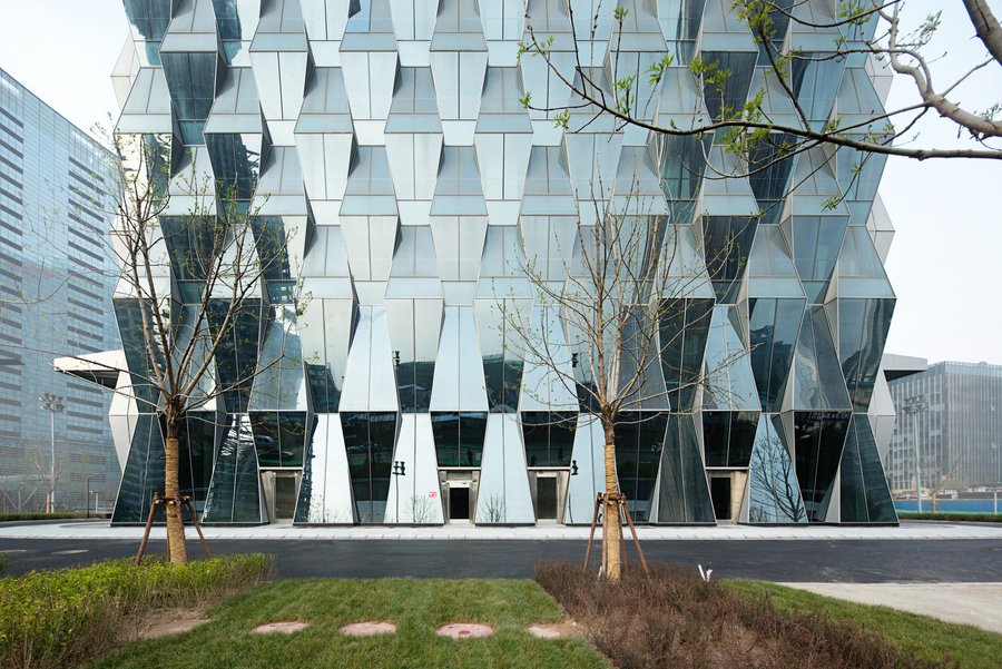 Фасад башни в Пекине по-другому адаптирован к климатическим условиям. Здания полностью облицованы рельефными стеклянными панелями с переплетённой структурой, визуально повторяющей технику плетения. Этот приём придаёт небоскрёбу лёгкость и одновременно выполняет функциональную роль: переплетение создаёт мягкие тени внутри помещений, регулируя уровень солнечного света и температуру. Отражающая поверхность стекла также рассеивает солнечные лучи на улицу, обеспечивая дополнительное освещение.