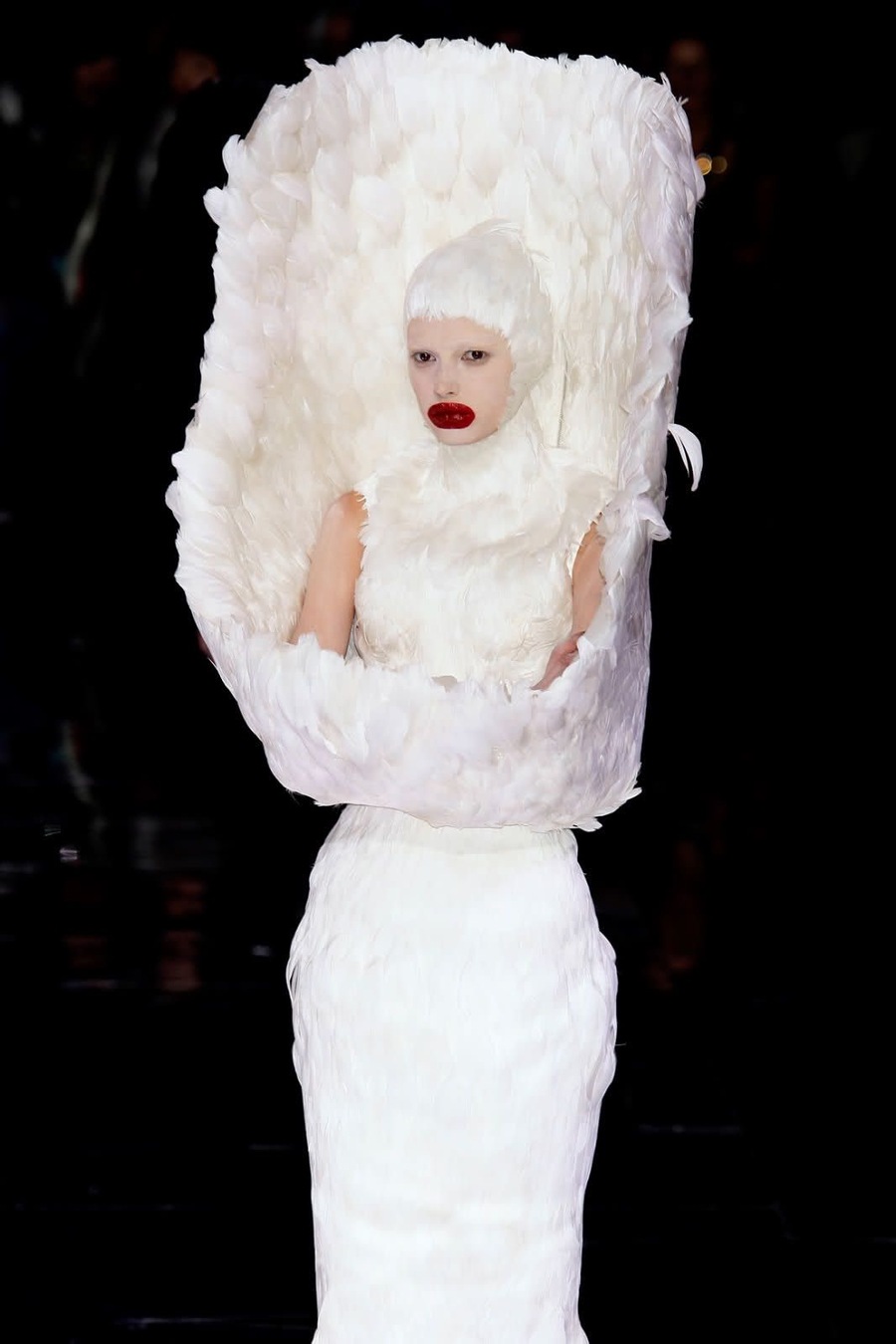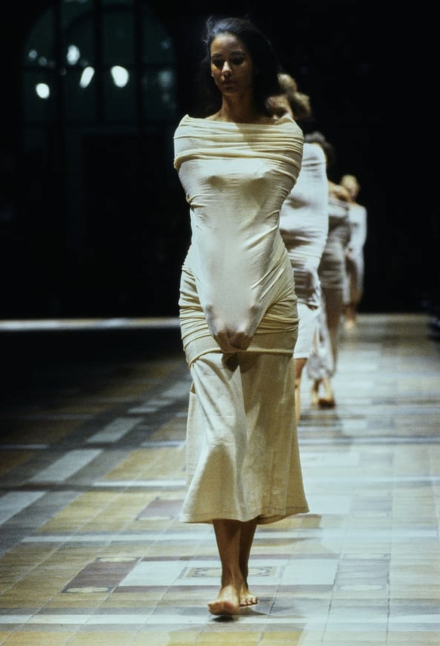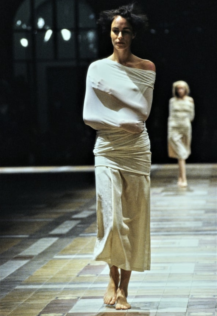 Maison Margiela всегда работал с тканью как с телесным архивом, превращая материю в следы человеческих историй и утрат. Деконструкция у Маржела — это не просто эстетика, а способ показать, как травма расшатывает форму, оставляя следы вмешательства и отсутствия. Многие ранние коллекции используют «перешитые» вещи, которые уже жили прежней жизнью, будто бы сохраняя память о тех, кто их носил. Ткань у Маржела обращается в рану вывернутые швы напоминают шрамы, а разрезы превращаются в визуальные метки боли. В его работе материальность одежды говорит о невозможности полной реконструкции себя после утраты, но и о попытке собрать себя заново. Бинтование, перевязки, обмотки тела в коллекции Artisanal создают связь с лечебными практиками, где ткань становится инструментом исцеления. Часто вещи выглядят недошитыми как будто процесс восстановления всё ещё продолжается, и человек внутри них всё ещё собирает себя. Белый цвет, ключевой для бренда, приобретает смысл очищения и перерождения, но при этом сохраняет стерильность больничного пространства. Анонимность модели в масках указывает на расщепление личности травма размывает лицо, превращая его в многослойный объект. В Маржела ткань становится свидетельством: она хранит следы рук, следы боли, следы истории и позволяет пережить травму, не скрывая её.