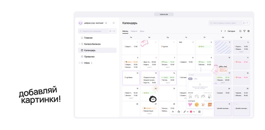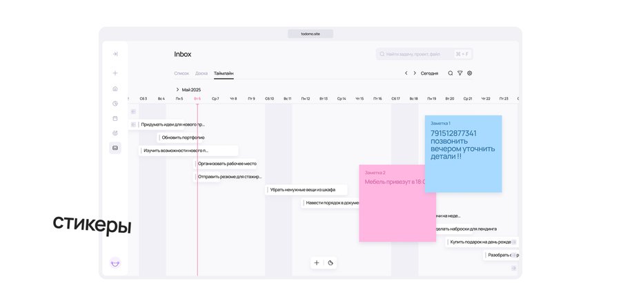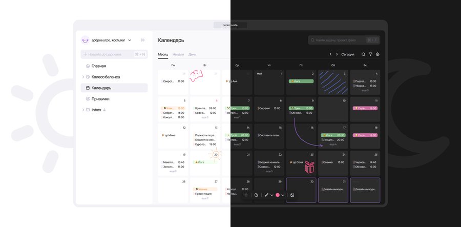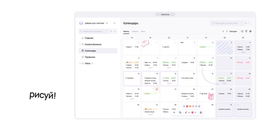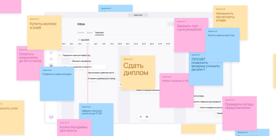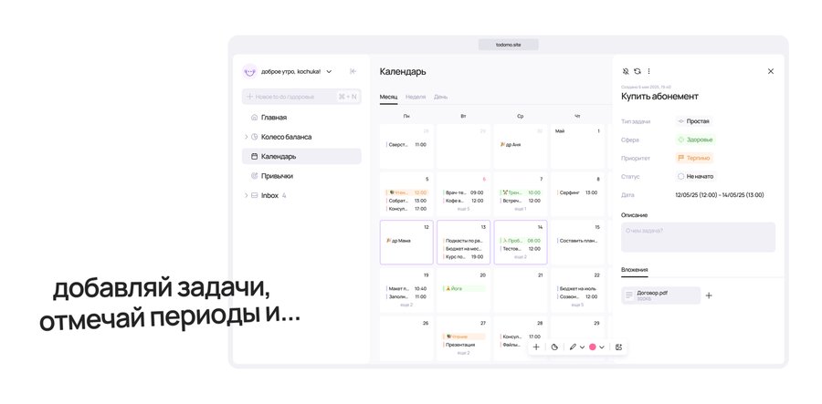 Todomo — твой персональный помощник для эффективного и удобного планирования задач и целей. В нём совмещено всё, что поможет наладить баланс в сферах жизни и комфортно планировать и отслеживать важные дела и прогресс