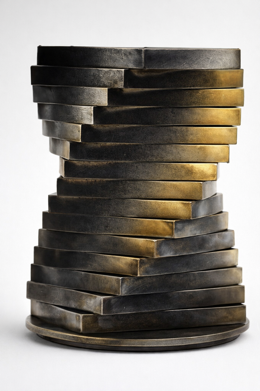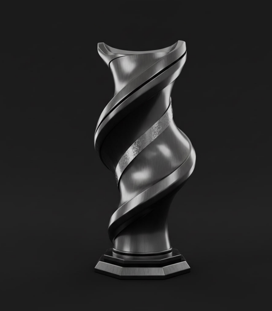 Ваза промпт: Minimal 3D render of a spiral vase in dark matte aluminum, low contrast, soft shadows, white background.
