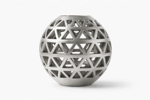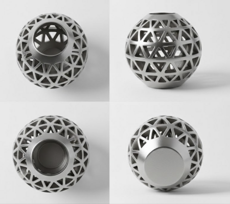 Декоративный предмет (ваза для сухоцветов) промпт: 3D visualization of a spherical metal decorative vessel designed for additive manufacturing. Hollow sphere with a uniform triangular.