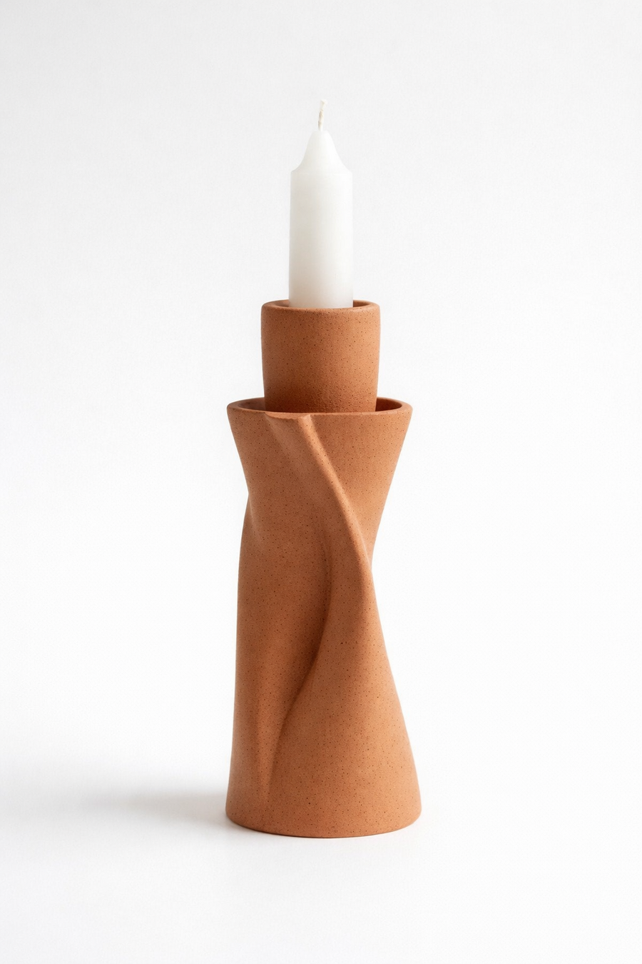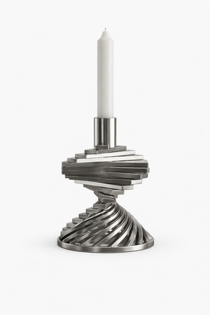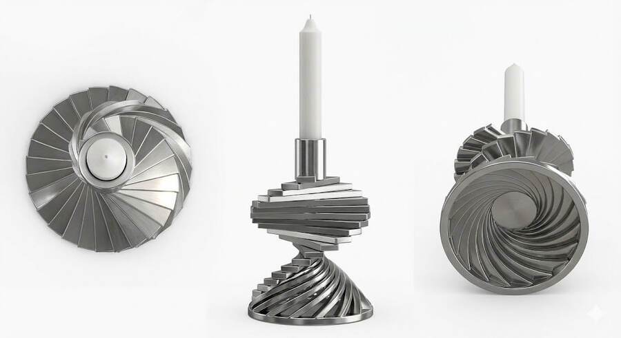 Подсвечник промпт: 3D render of a spiral metal candlestick designed for additive manufacturing. Vertical twisted geometry, matte metallic surface, neutral gray. Minimal, architectural design.