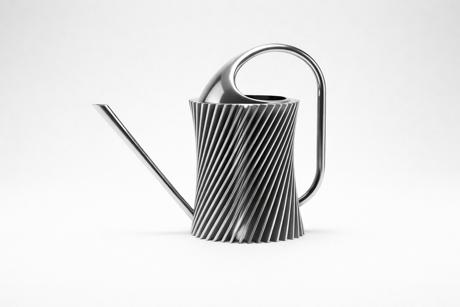 Лейка промпт: Stainless steel watering can with a sculptural twisted body, spiral ribbed texture, smooth curved handle and long elegant spout, minimalistic modern design, studio lighting, white backgr