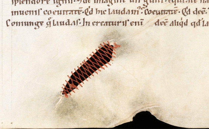Из-за дороговизны пергамена испорченные листы не выбрасывали, а зашивали причудливым образом. Получались своеобразные книжные шрамы, заделанные цветными нитками.