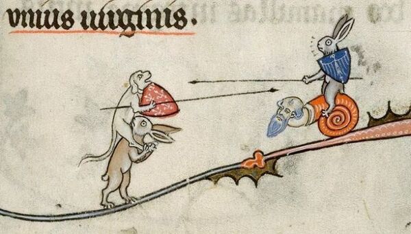 Наиболее распространённая версия: улитка символизирует трусость, а рыцарь, сражающийся с ней — человека, боящегося ничтожного противника. В манускрипте XIV века изображён мужчина, бросающий меч перед улиткой — визуализация идеи «не бойся того, кто не опасен». Улитка часто показана с раковиной, напоминающей рыцарский щит или шлем, что усиливает комический эффект. Рыцари обычно вооружены мечами, копьями и в полном доспехе, что подчёркивает контраст между мощью и безобидностью улитки. Вариации включают нападение на улитку дамами, монахами или обезьянами, расширяя трактовки этого символа.