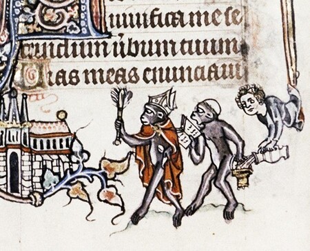 Обезьяна в пародийном пространстве маргиналий занимает особую роль, символизируя идею подражания. Она изображается в различных ролях: крестьяне, епископы, писцы, калеки, рыцари, школьники, учителя, влюблённые и врачи — все они выступают как зеркала и высмеивание сословий и профессий, включая власть и духовенство, показывая их пороки. В Англии и Франции фривольный декор с обезьянами называли «бабуинами», подчёркивая их как средство сатиры и богохульства.