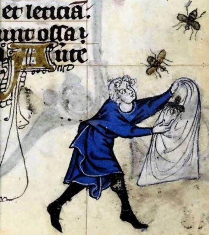 Часослов. 1310–1320 гг. Человек пытается поймать рой пчёл.