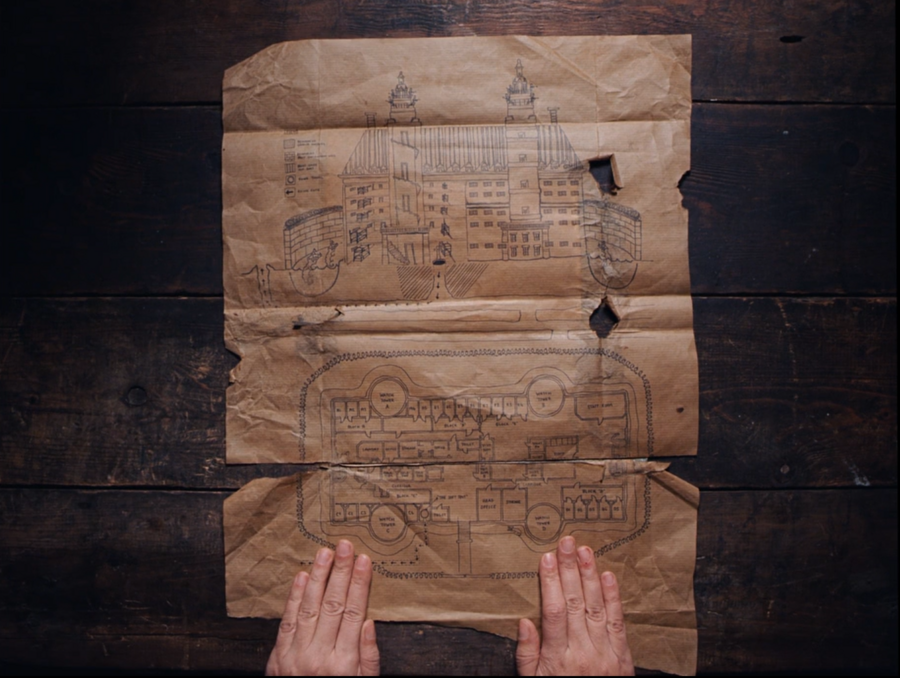 Так же режиссер любит использовать верхний крупный план. Этот прием встречается практически в каждом фильме Андерсона. Благодаря этому кадры кажутся ненастоящими, словно настольная игра или детский конструктор. Такой ракурс представляет пространство в четко организованную схему, подчеркивает его геометрию и показывает, что мир фильма тщательно продуманный и имеет выстроенную визуальную структуру.
