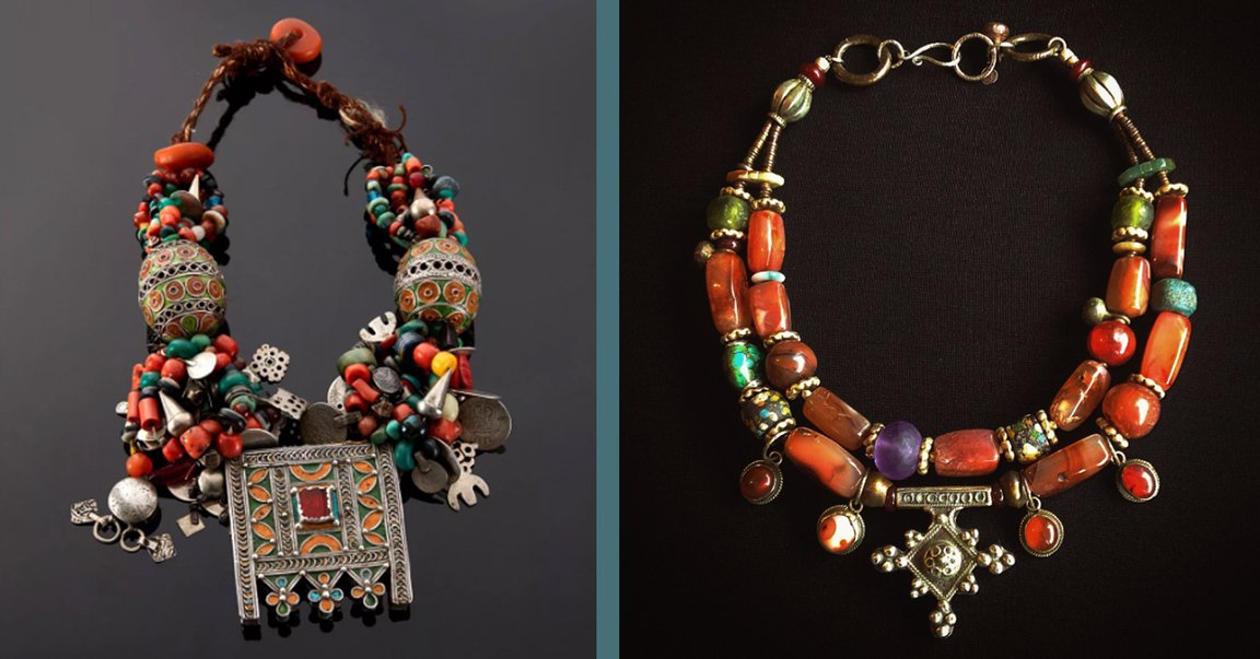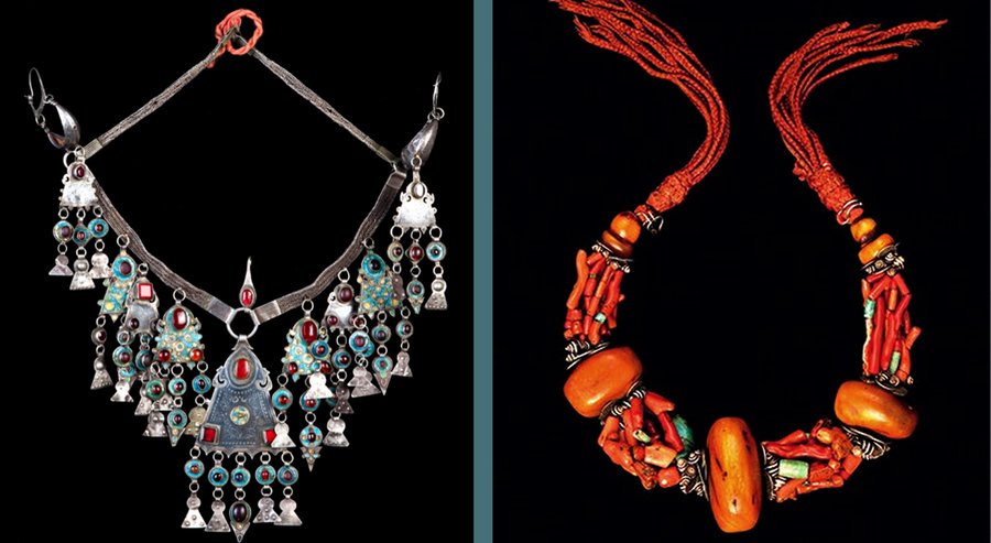 1. Йеменское ожерелье, серебро, XII век 2. Йеменское ожерелье, серебро и кораллы, XIX век