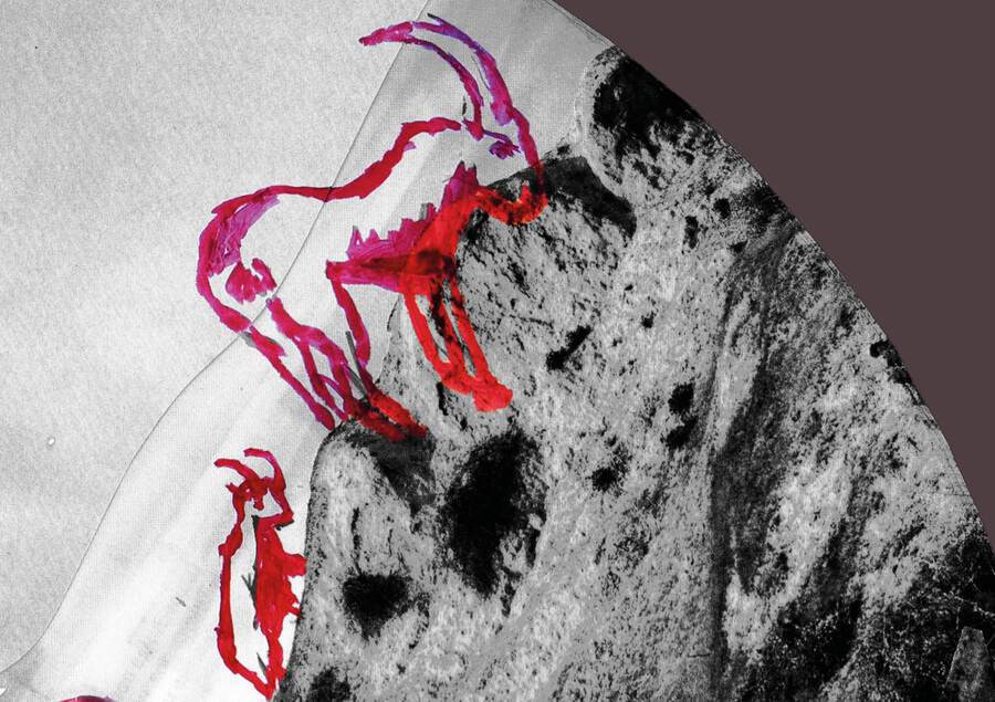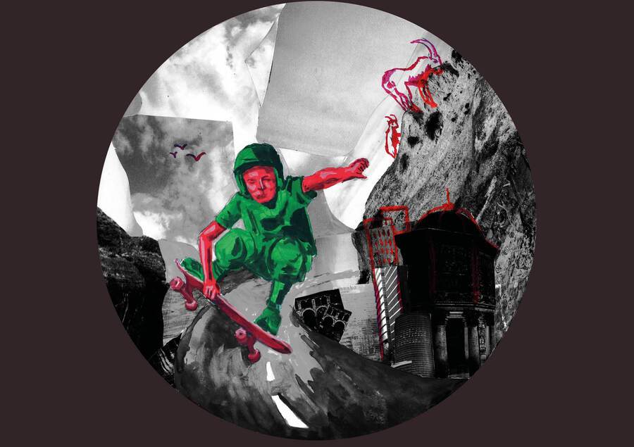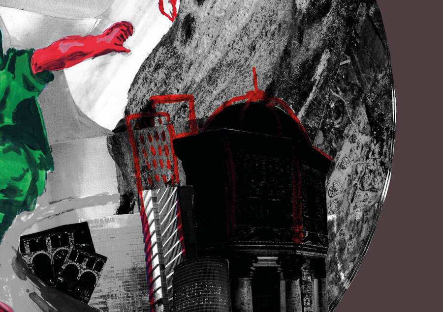 коллаж и гуашь взаимодействуют, накладываясь друг на друга. так соединяются части композиции