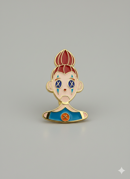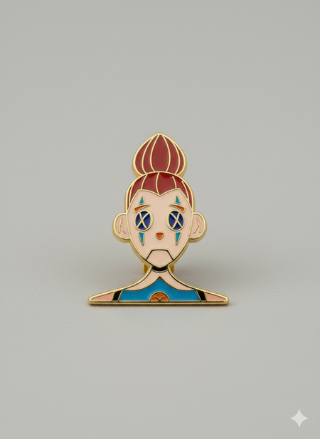 Нейросеть: Gemini Промпт: Generate a metal enamel pin featuring the face of a character, polished gold outline, hard enamel finish, glossy metallic highlights, clean simple background, product photo lighting, centered composition, die-cut pin shape, focus on the character’s face, realistic shadows, professional merchandise photography.
