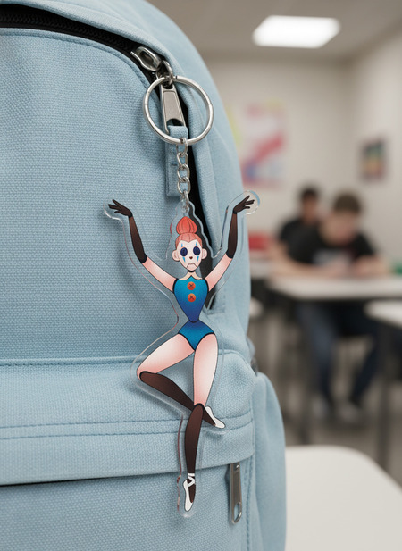 Нейросеть: Jay Flow Промпт: Create a plastic keychain based on the character in the image. The final image should look like a photo. The keychain should hang on a blue backpack.