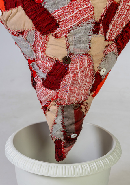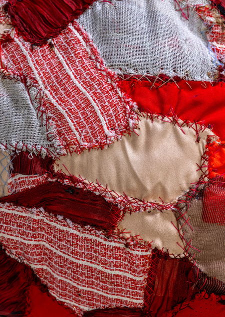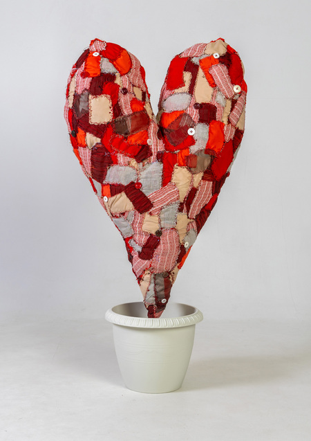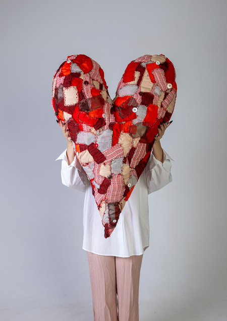 Я контрастирую с простой формой сердца и сложностью текстуры — вышивка, разноформенные лоскуты, скрепляющие пуговицы — контраст акцентирует внимание на том, как важно осознавать трудоёмкость любви, а не бежать за идеализированной картиной чувств.