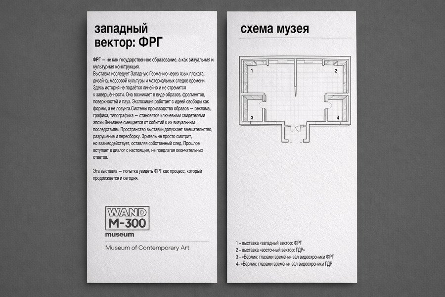 1 — выставка «Западный вектор: ФРГ» 2 — выставка «Восточный вектор: ГДР» 3 — зал видео-хроники ФРГ 4 — зал видео-хроники ГДР