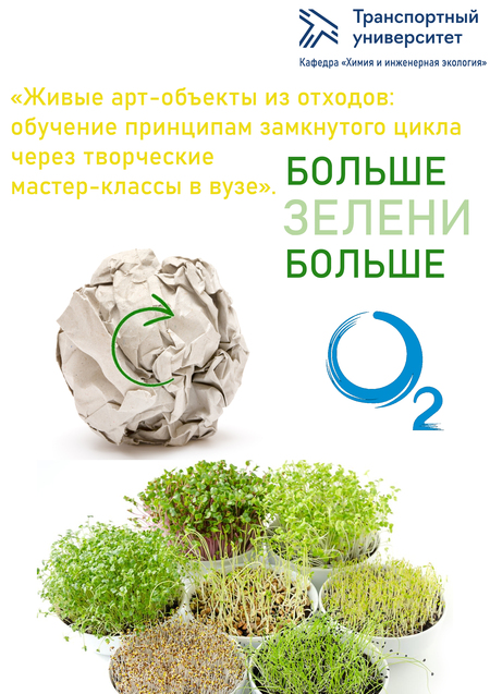 Описание: Проект реализуется в лаборатории РУТ (МИИТ) и включает мастер-классы по переработке бумажных отходов и яичных лотков в субстрат с использованием экологически чистых удобрений. Из него создаются «живые арт-объекты» — открытки, скульптуры, в которых вырастает микрозелень. В рамках проекта проходит акция «Пламенный привет от химиков». Студенты участвуют в реализации, формируя экологическую ответственность и профессиональные навыки. Проект представлен в вузе, участвовал в акции «Ночь в музее»