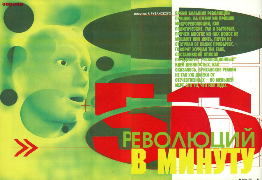 Яркие цвета, коллажи, разносортная типографика. Хаос на страницах издания отражает общую культурную неопределённость и жажду перемен.